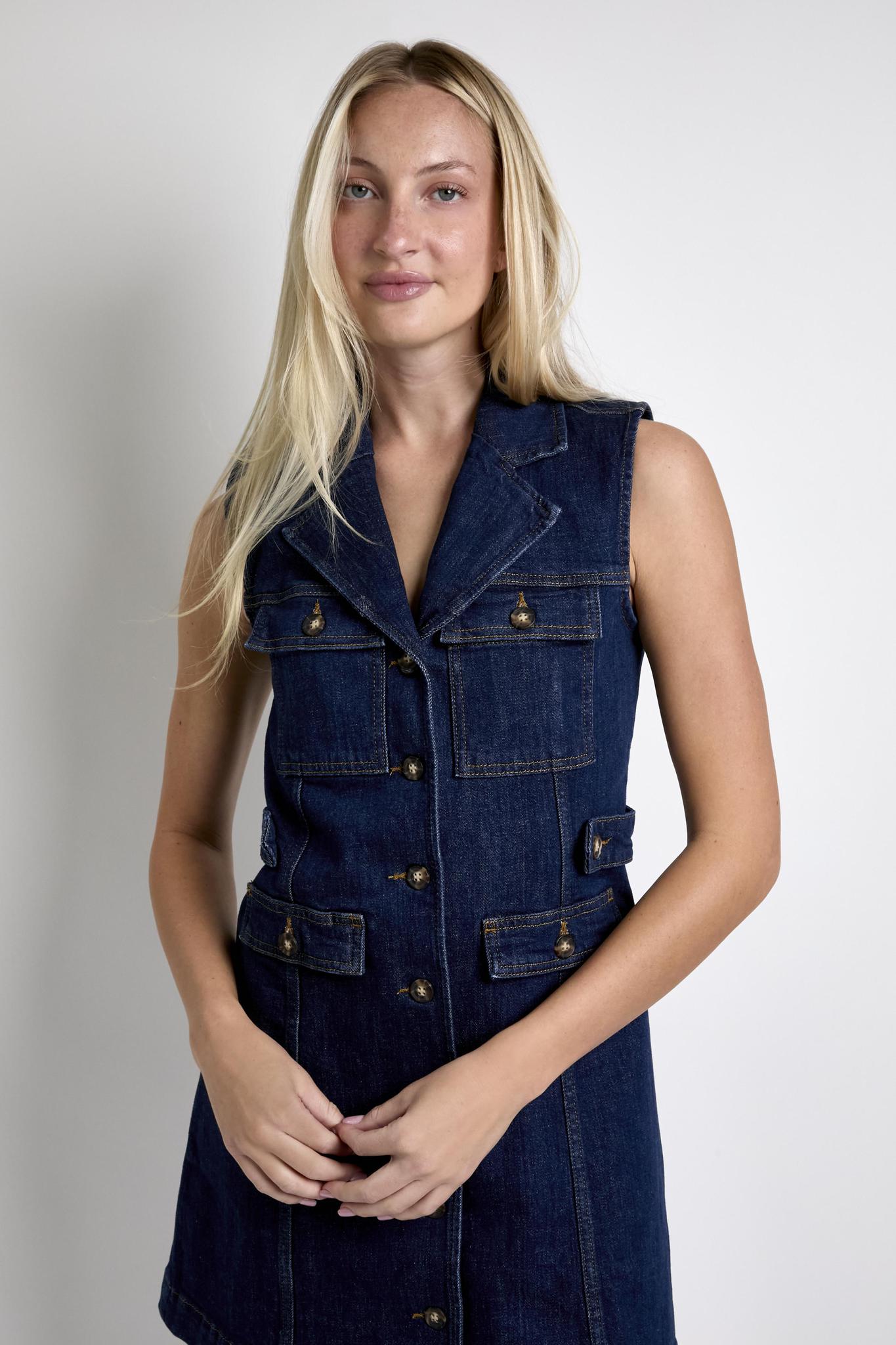 Meet Andria, the effortlessly cool safari-inspired denim dress you’ll be wearing on repeat. This sleeveless mini dress is designed with four front pockets, a notched collar, tabs to accentuate the waist, contrast stitching and tortoiseshell buttons. Crafted from super soft dark wash denim, Andria is perfect for dressing up with platform sandals or down with a pair of sneakers.