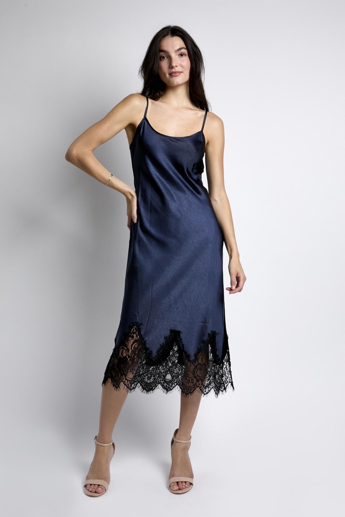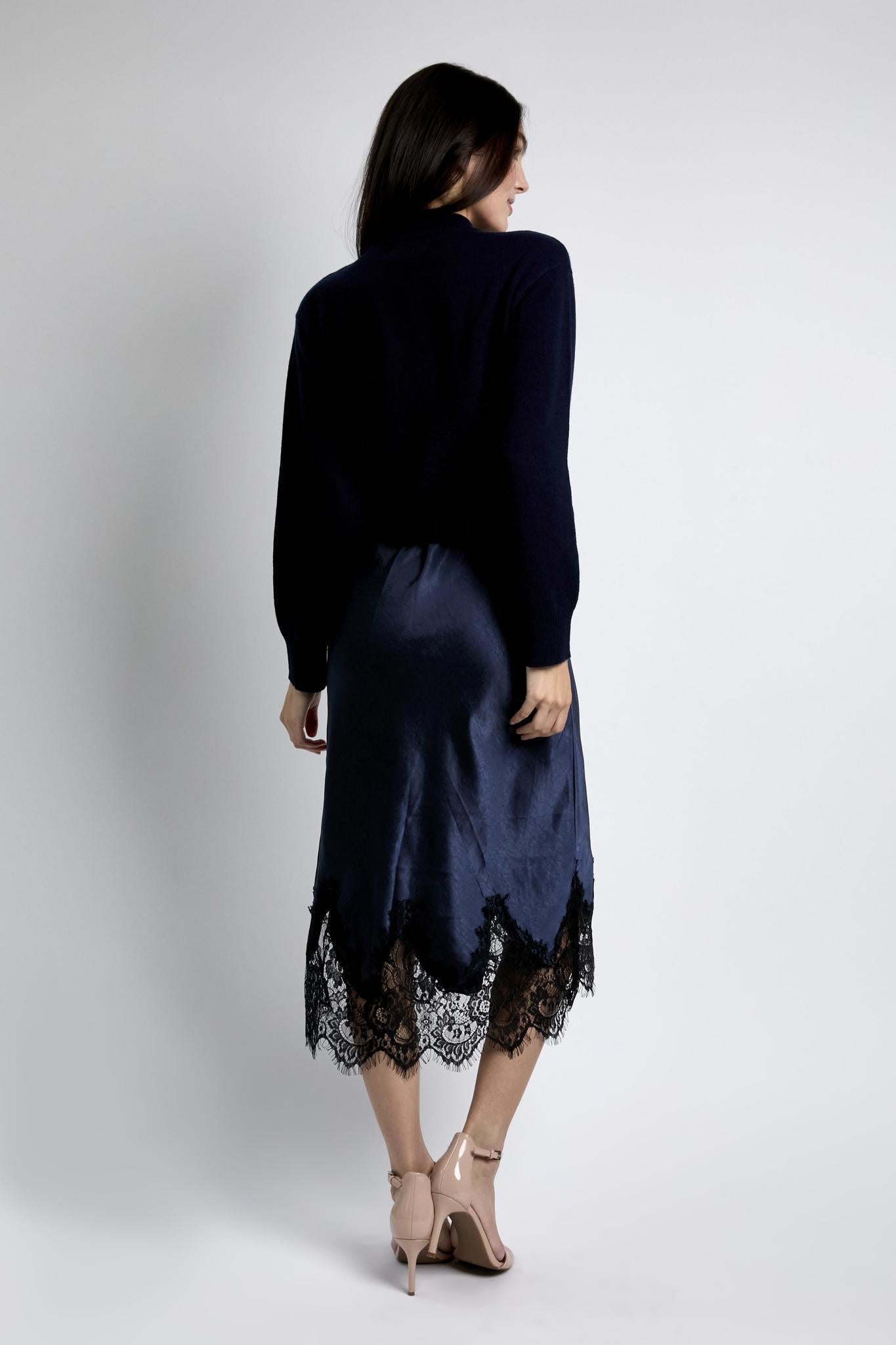 Meet our Navy Sweater Dress, which combines a knit wool-cotton crewneck sweater with a satin midi-skirt for a layered look. The bottom hem is finished with contrasting delicate lace trim.