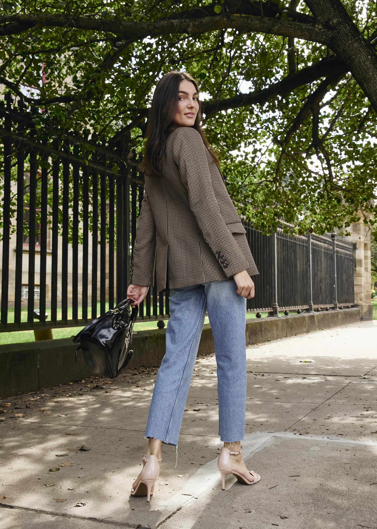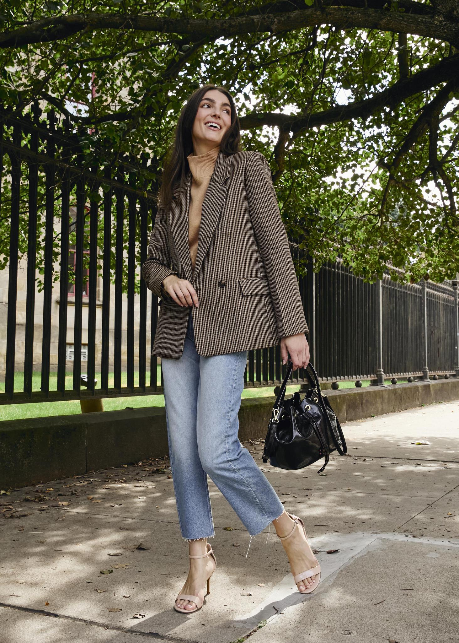 The Quentin Blazer is crafted from a wool blend in a classic brown houndstooth print. This double-breasted blazer features a notched collar and lapel with a relaxed fit and a new, refined inside lining. Designed with welt pockets and finished with horn buttons, this piece combines timeless style with modern sophistication.